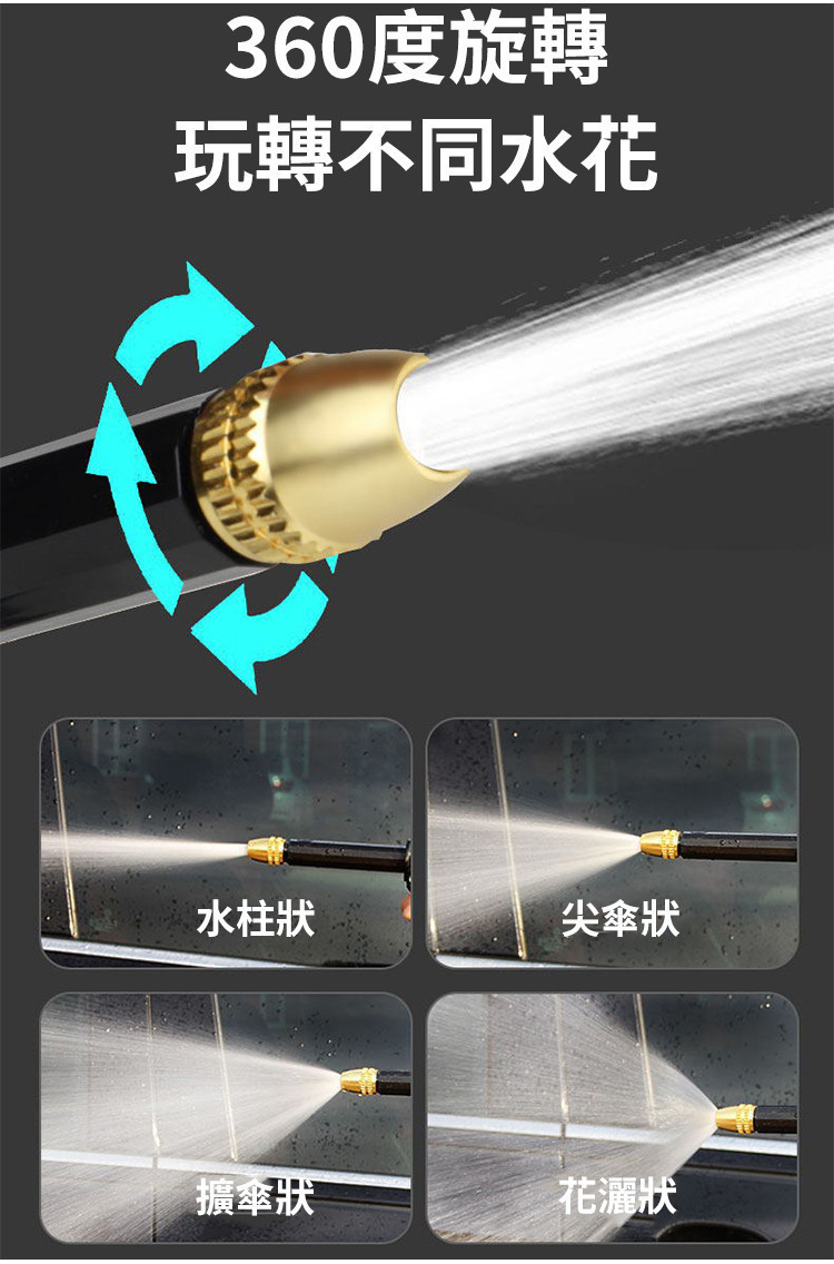 旋轉銅頭即可調整水柱、尖傘狀、擴傘狀、花灑狀,一槍多用。
