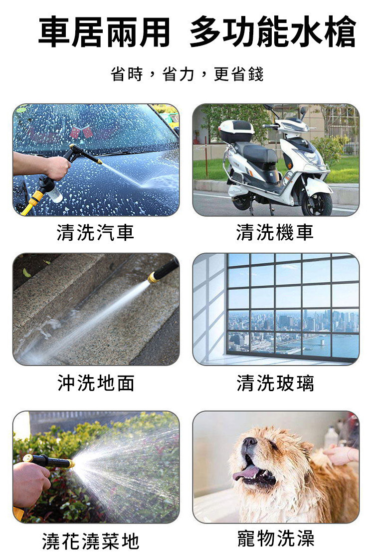 洗車、沖地板、澆花、清洗冷氣室外機、陽台排水、農作物沖洗等都適用。