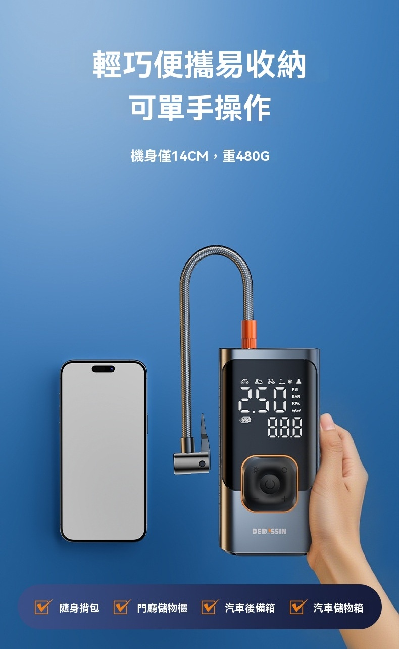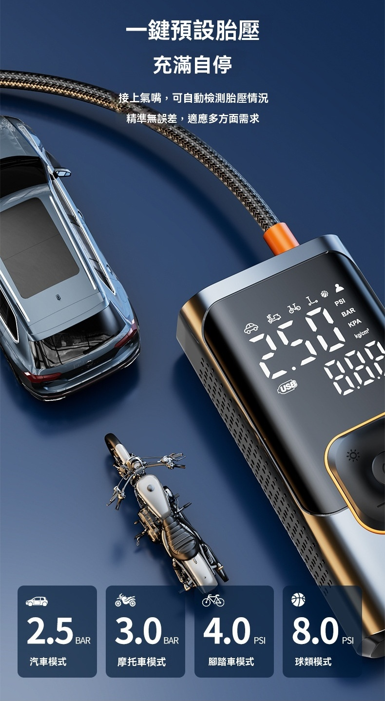 一鍵預設胎壓|汽車、摩托車、自行車、球類,多模式切換,充滿自停