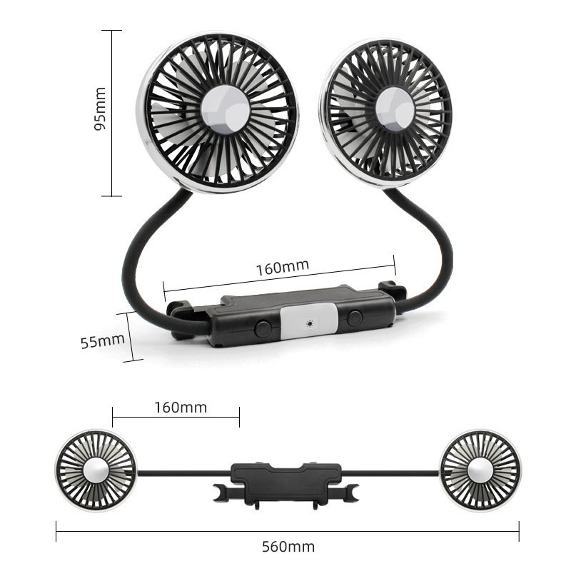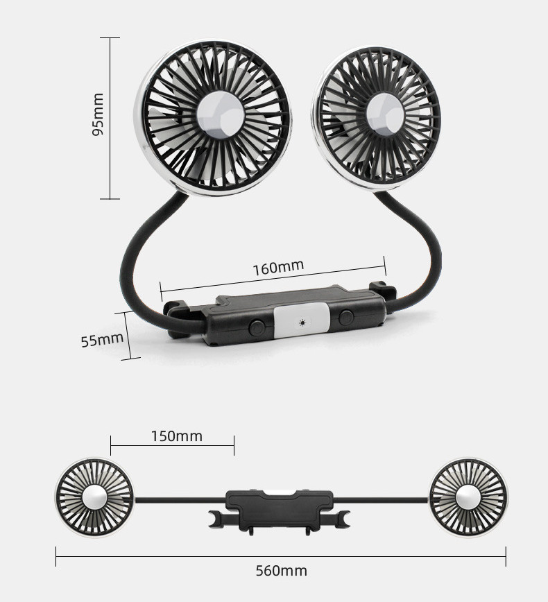 雙頭後座汽車風扇 車用風扇 三段風速可調 360度角度調節 LED夜燈設計 車內後座降溫專用 現貨【VR06002】