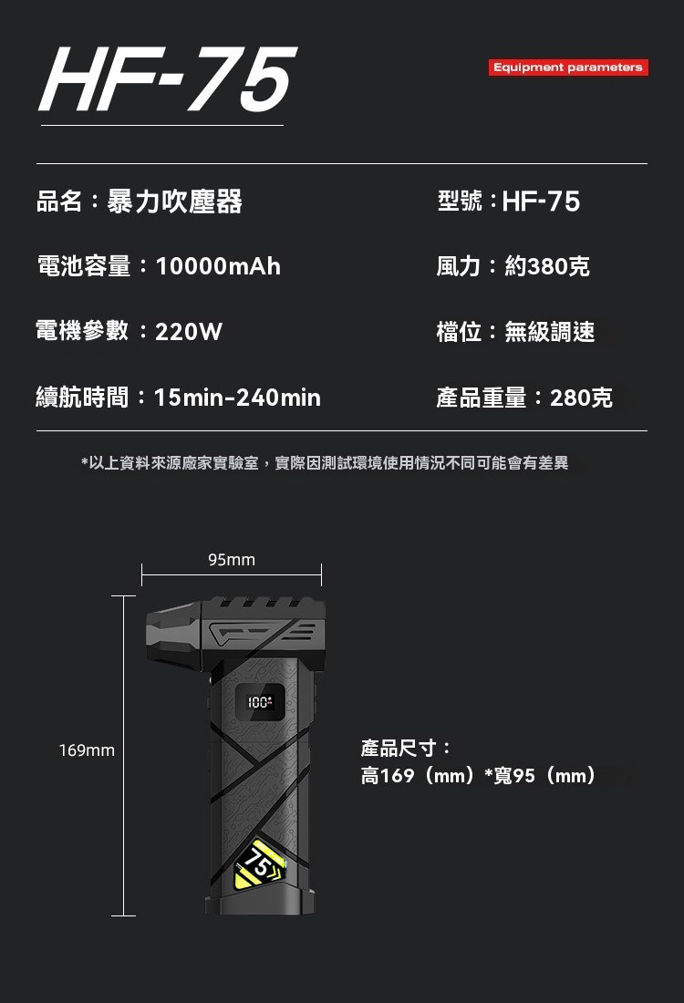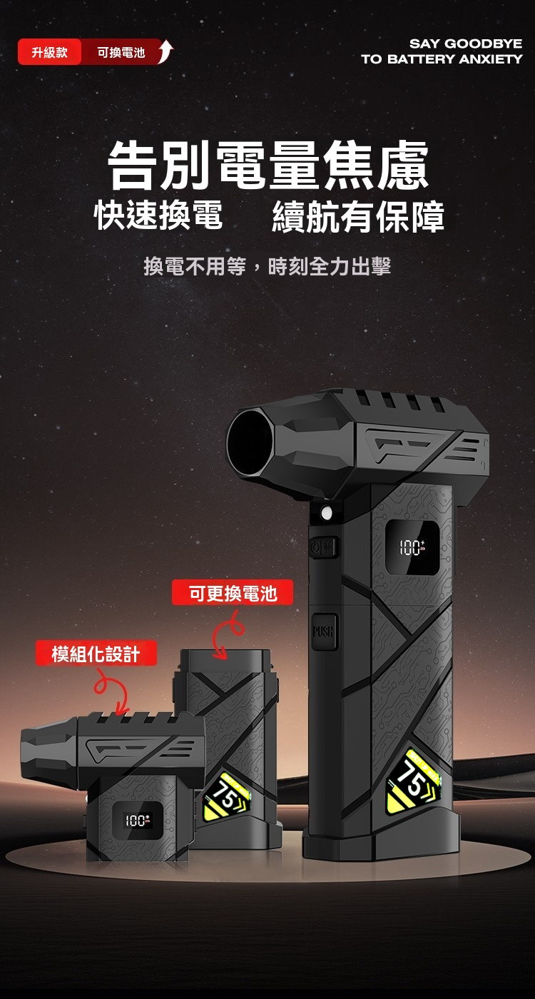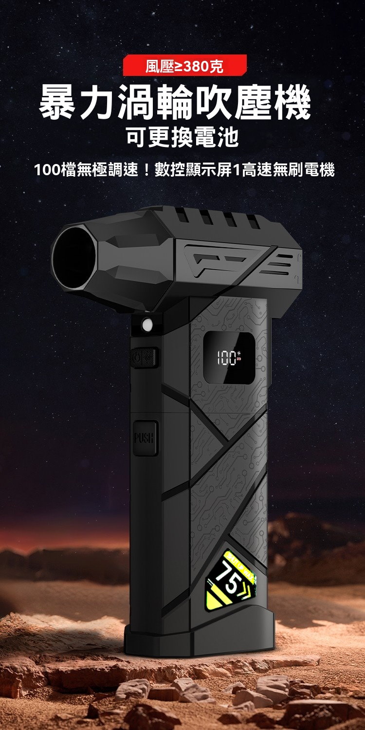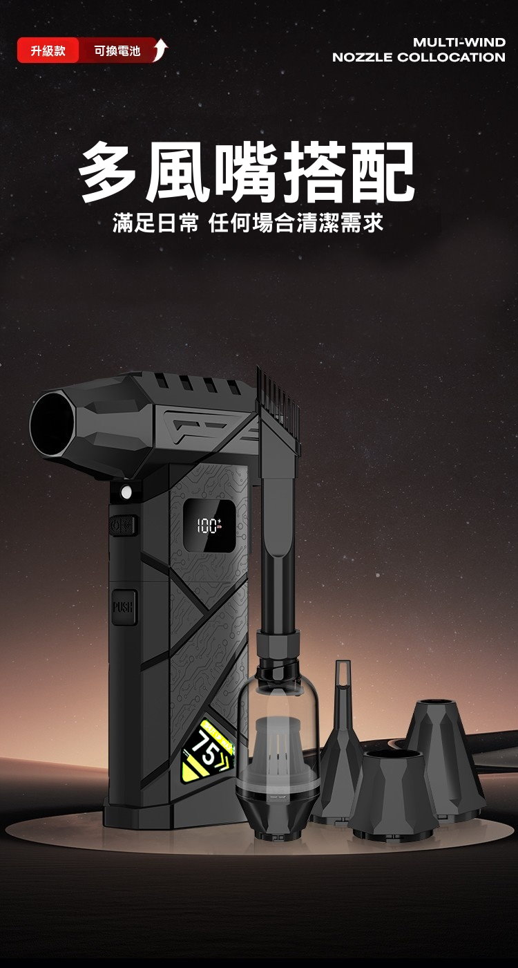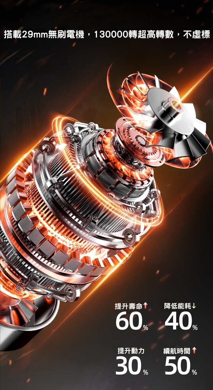 ・風壓高達380g,搭載29mm無刷電機,130,000轉高速渦輪,瞬間爆發強勁風壓