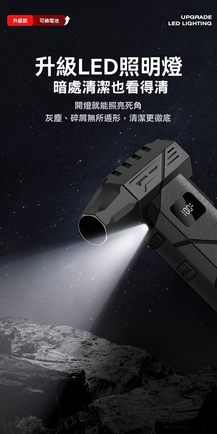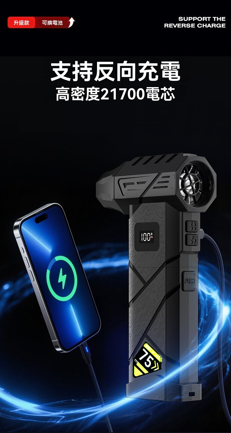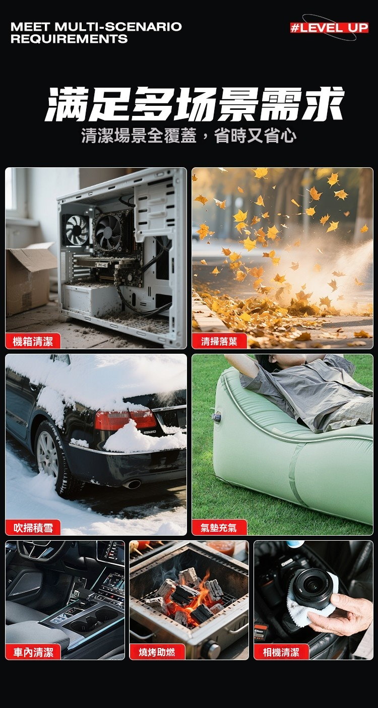 功能:吹塵、除塵、助燃、照明、吹水、反向充電
