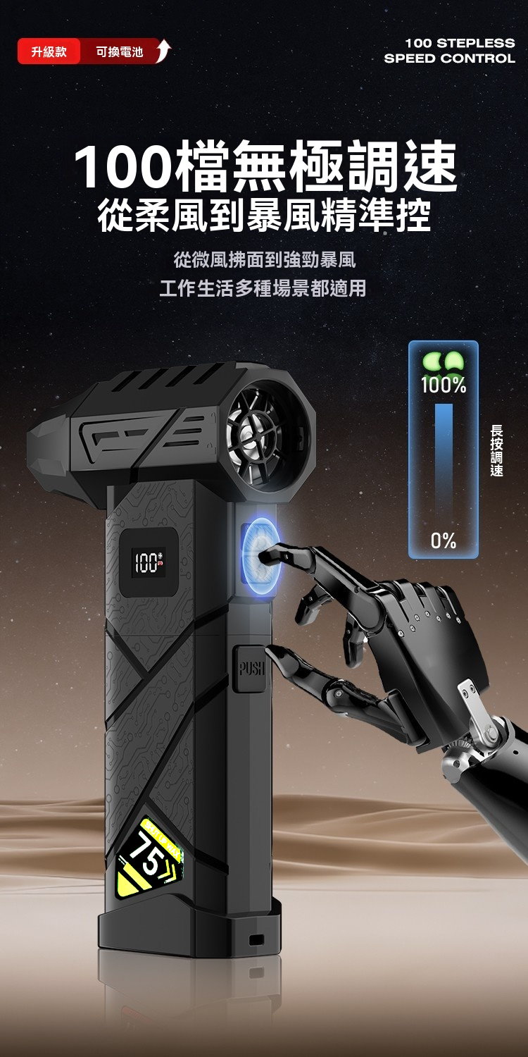 ・100檔無極調速+數控顯示螢幕,風速與電量同步顯示更直覺