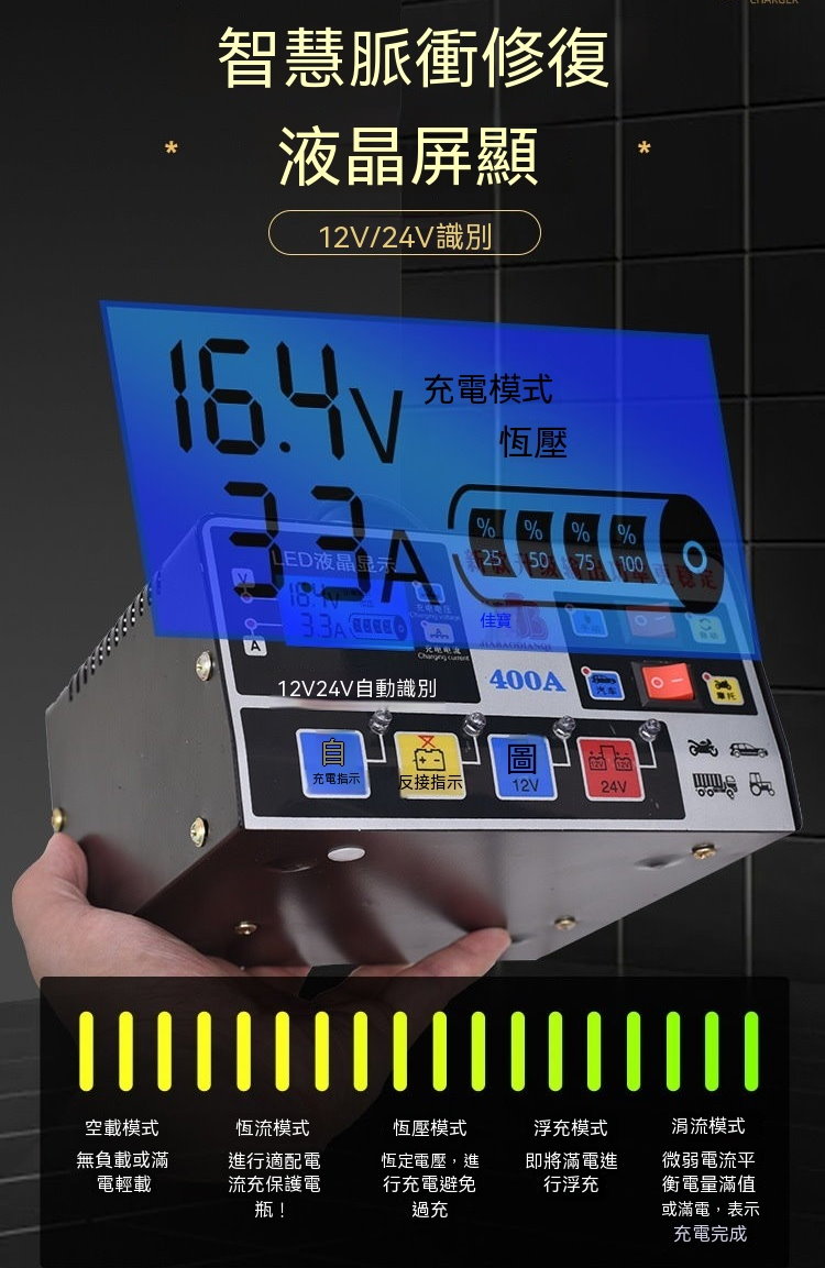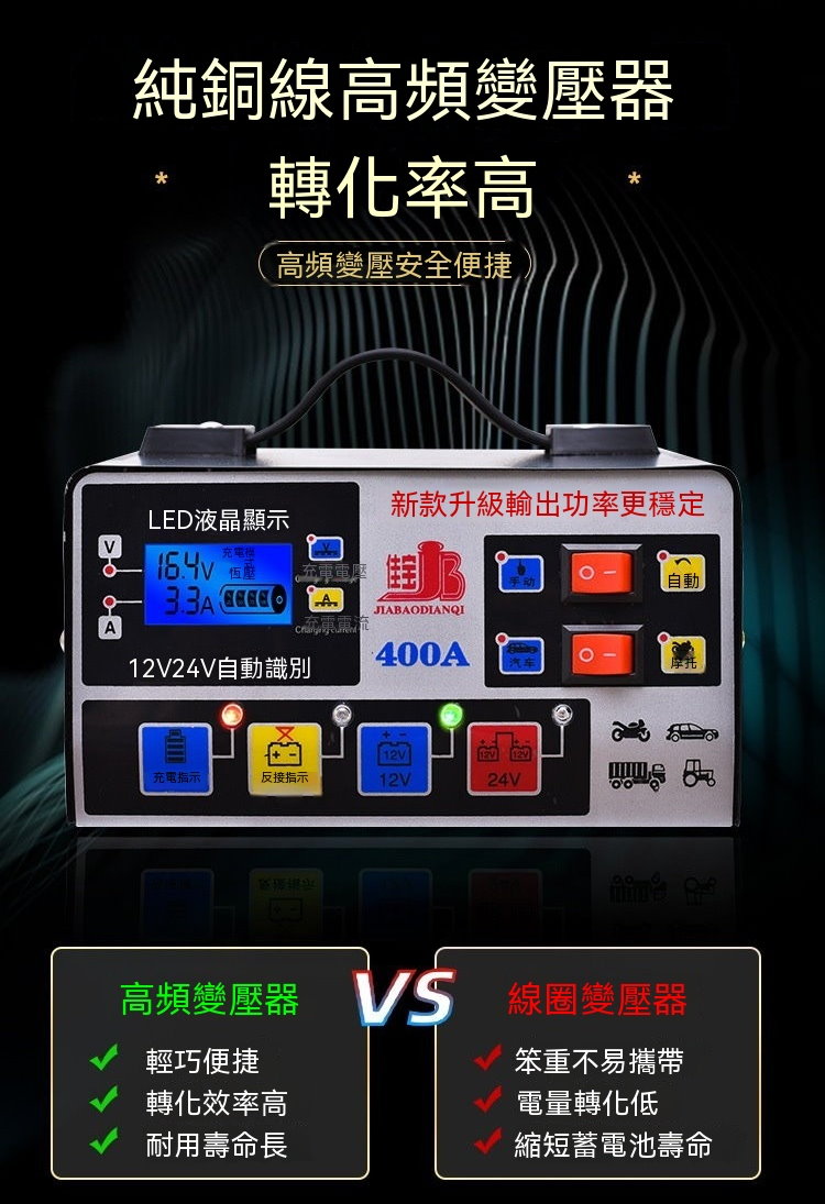 台灣現貨 一年保固 12V/24V 400W大功率電瓶充電器 110V充電檢測修復三合一充電 脈衝修復【VR04096】